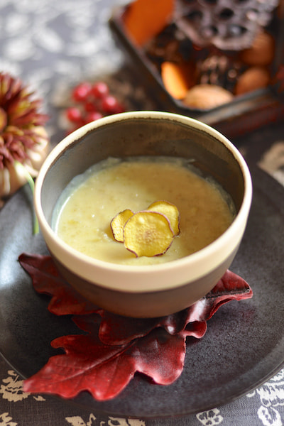 - 鍋にバターを溶かし、2の玉ネギとニンニクを炒める。ニンニクの良い香りがしてきたら、1の半月切りのサツマイモを加えてよく炒める。サツマイモの周りが黄色くなってきたら水を加えて、サツマイモが柔らかくなるまで煮る。途中アクが出るようなら取り除く。