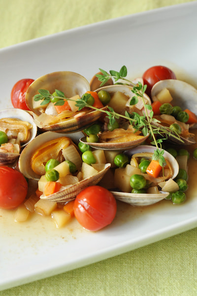 - 3の新玉ネギがしんなりとしてきたら、白ワインと水と1のアサリとタイム1本を加え、アサリの口が開くまで煮る。タイムを取り除く。ミニトマトを加え、塩、こしょうで味を調える。