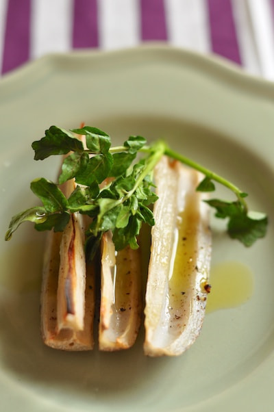 - レンコンをお皿に並べ、黒こしょうをふって、温かい内にいただく。