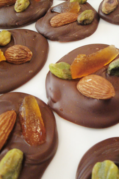 - 温かいチョコレートをワックスペーパーの表の円に合わせてのせ、チョコレートが乾かない内にアーモンド等をのせる。そのまま室温で固める。急ぐ時は冷蔵庫で固める。