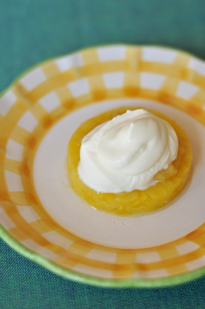 - 盛り付け。お皿に2の輪切りのパイナップルを敷き、上にパイナップルバナナソースをかけ、5の生クリームを飾る。