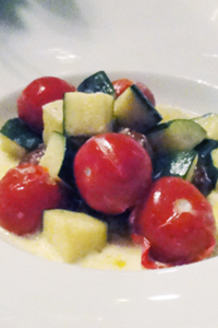 - 器に3の豚肉を入れ、その上にズッキーニとトマトのソースをかける。