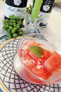 - 盛りつけ。器にスイカを入れ、その上に固まったゼリーをいったん混ぜてほぐして、きらきらゼリーにし、それをスイカの上にかける。ミントを飾る。