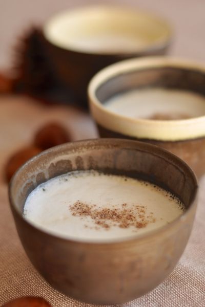 - 器に3の栗のスープを入れ、その上に4の泡立てた牛乳をのせ、オールスパイスをふる。