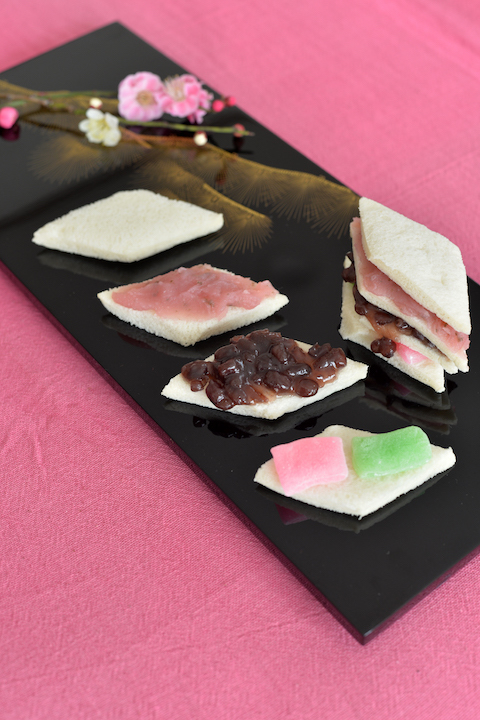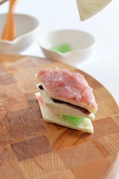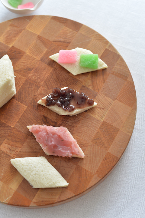 サンドイッチ用パンを縦長に半分に切り、更に菱形に切る。(1枚で4枚の菱形)