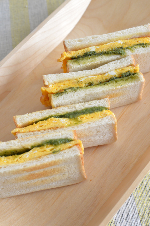 1枚のパンにマヨネーズを塗り、玉子をのせ、ジェノベーゼソースを塗る。もう1枚のパンではさんだら出来上がり。お好みの大きさに切っていただきましょう。
