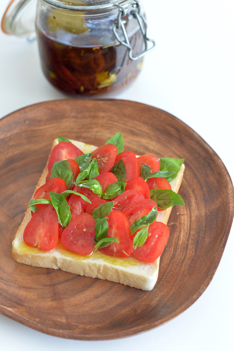 ミニトマトは食べやすい大きさに切り、パンに並べてバジルを飾る。