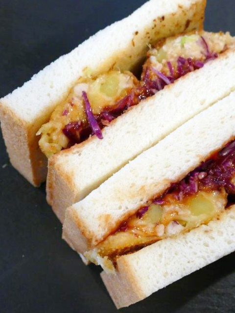 ウスターソースとトマトケチャップを混ぜたソースをかけ、パンではさむ。