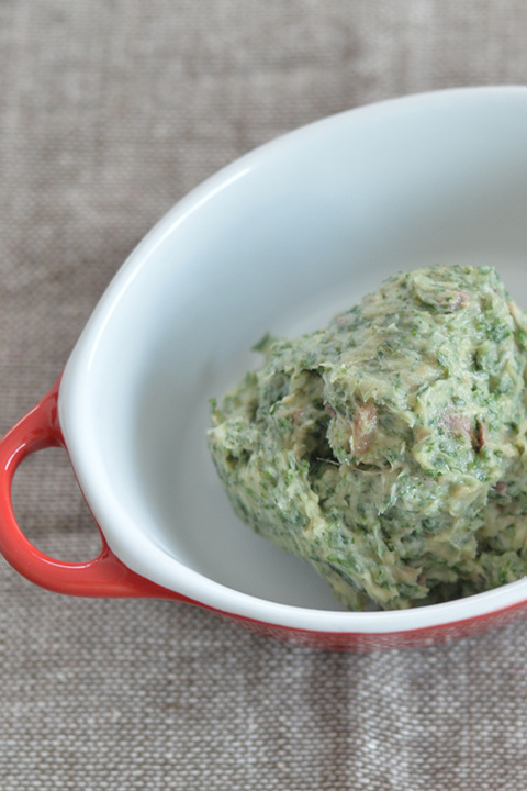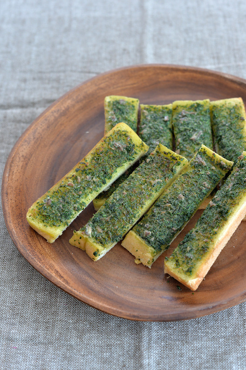 パンにアンチョビーバターを塗り、オーブントースターで2分ほど焼く。好きな大きさに切る。