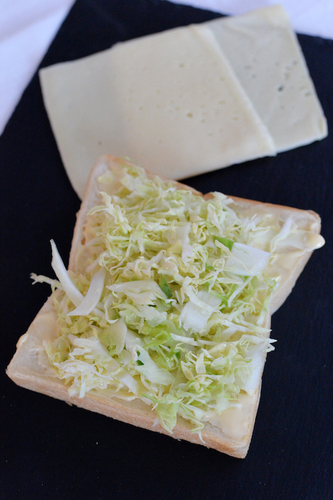 キャベツの千切りに軽く塩をして、食パンの上にたっぷりとのせる。