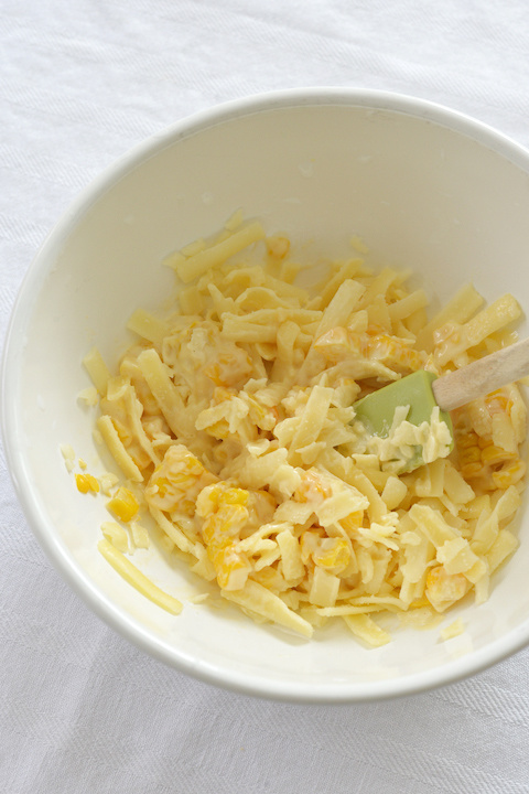 トウモロコシ、ピザ用チーズ、マヨネーズを混ぜて、パンの上にのせる。