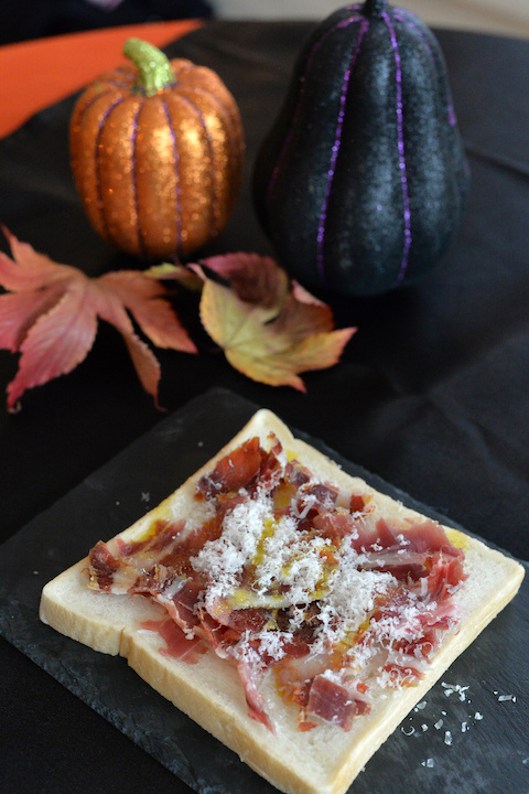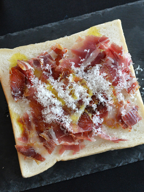 パンの上に生ハムをのせ、パルメザンチーズをすりおろす。