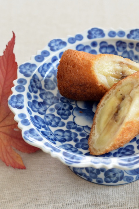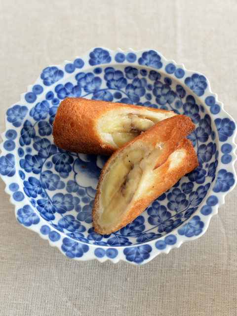 パンの耳は切り落とし、真ん中にバナナをおく。パンを2つに折り、爪楊枝で止める。両端は手で押さえて軽くつぶす。油で狐色になるまで揚げる。グラニュー糖をかけ、お好みでシナモンパウダーをふる。