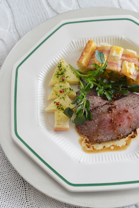 パンはナイフでツリー型に切る。溶かしバターを塗り、軽くトーストする。パセリをふり、ピンクペッパーを飾る。