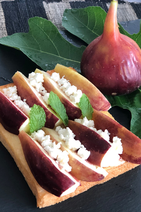 イチジクは皮付きのまま縦に8等分に切り、トーストの上に並べる。カッテージチーズをおき、ミントを飾る。
