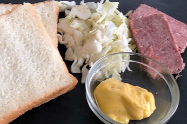 トーストしたパンにお好みでマスタードを塗り、コンビーフとキャベツの炒め物をのせる。パンで挟んでできあがり。