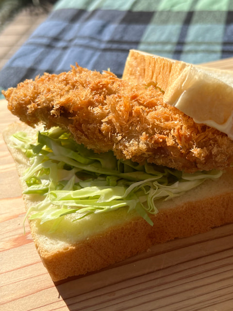 パンに溶かしバターとマヨネーズを塗り、キャベツとヒレカツを挟む。
