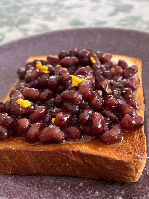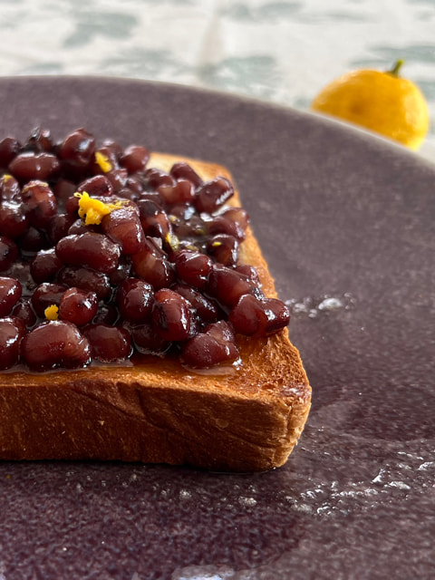 トーストの上にたっぷりの餡をのせ、溶かしバターをかけて、柚子をすりおろす。