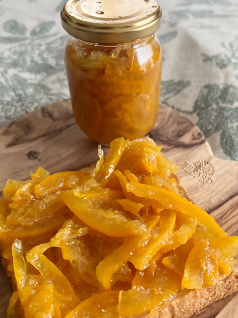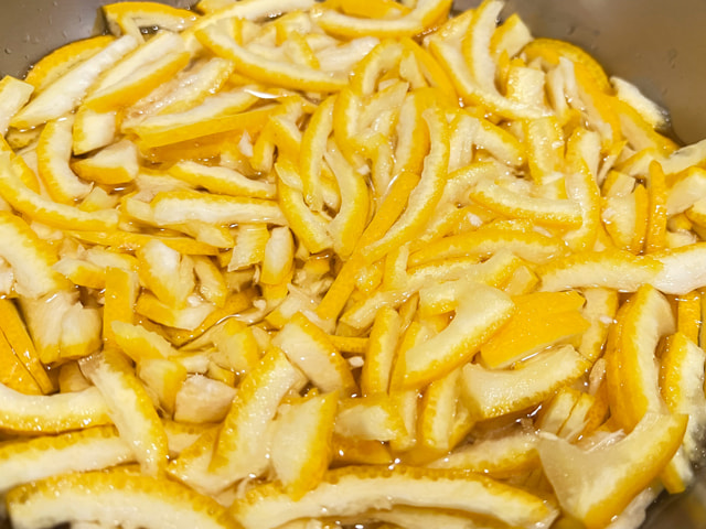 ホーローの鍋に3の皮の薄切りを入れ、水をひたひたに加える。このまま3時間以上置く。この間に皮の白い部分のペクチンが引き出されて、とろみと艶が良く出るようになる。