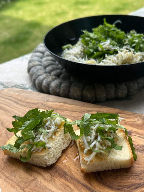 フライパンにオリーブオイルとニンニクの微塵切りを入れて良い香りがしてきたら、釜揚げシラスを加えて炒める。上にせん切り大葉をのせる。
