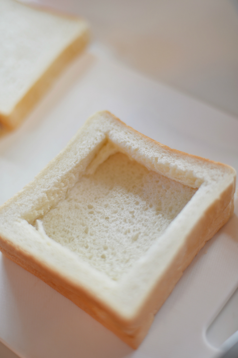 1枚のパンをパンの耳から1cm位のところから額縁になるように中をくりぬく。