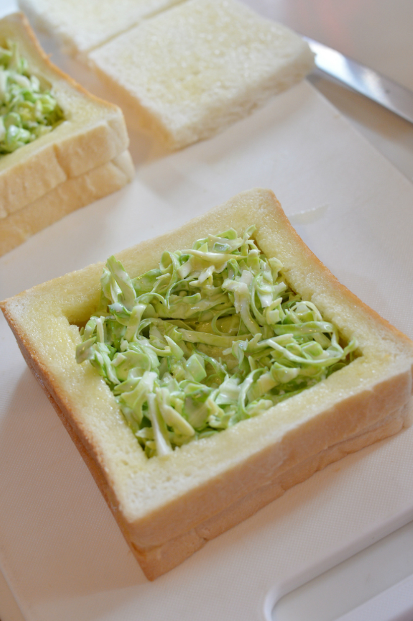 キャベツは薄切りにし、マヨネーズと塩、こしょうで和える。②のパンの中に詰めて、真ん中を少しへこませておく。