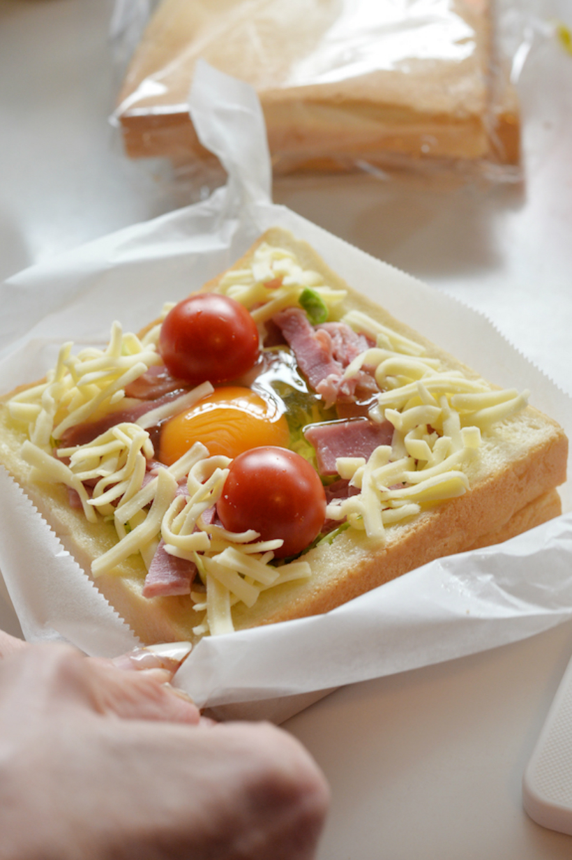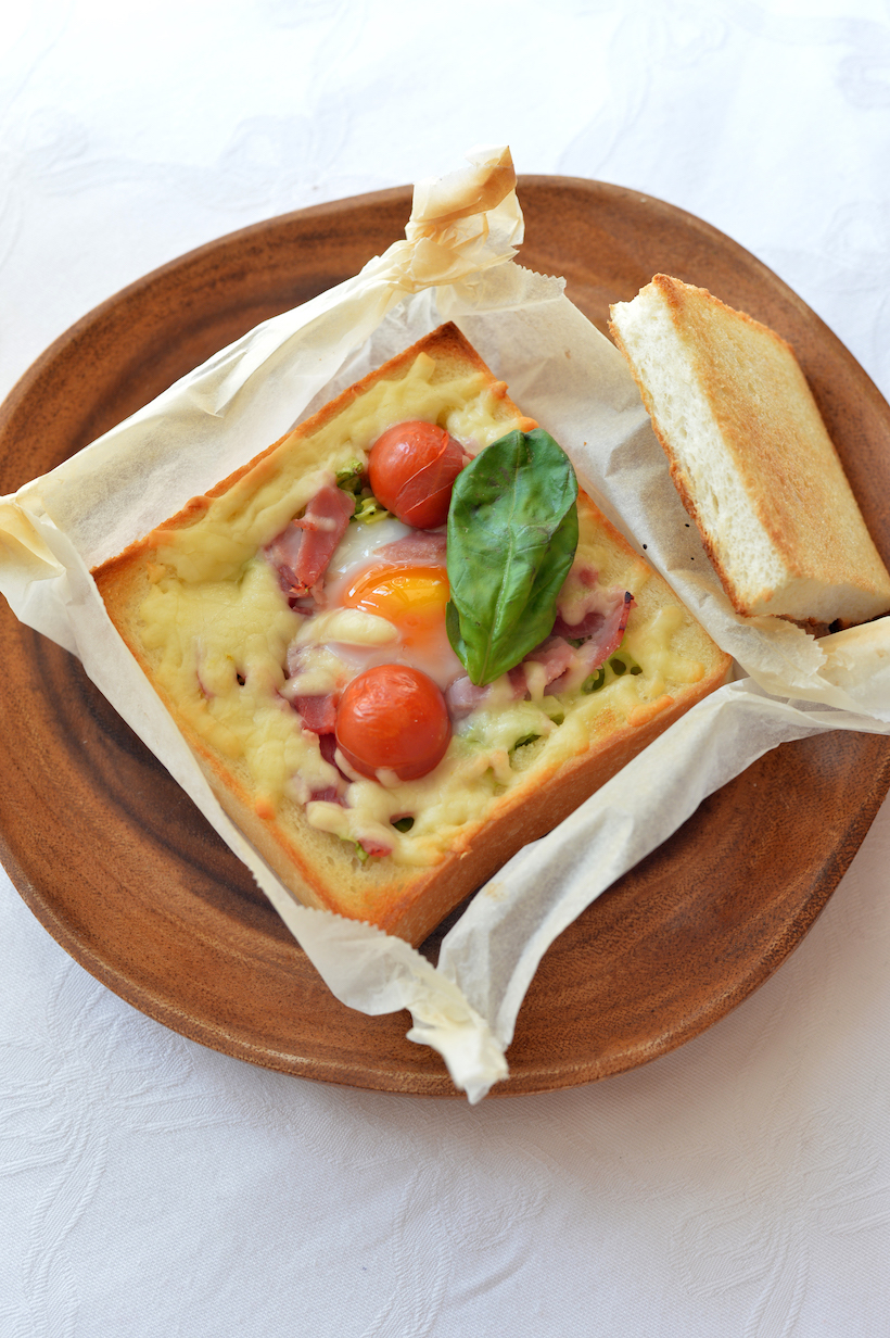 真ん中に玉子を割り入れ、ハムとミニトマトをのせ、パンのフチにピザ用チーズをのせる。
