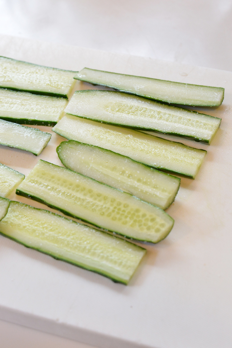 キュウリは縦に薄切りにし、軽く塩をふる。