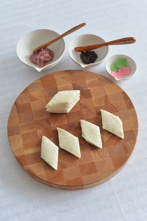 サンドイッチ用パンを縦長に半分に切り、更に菱形に切る。(1枚で4枚の菱形)