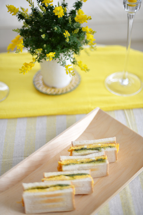 1枚のパンにマヨネーズを塗り、玉子をのせ、ジェノベーゼソースを塗る。もう1枚のパンではさんだら出来上がり。お好みの大きさに切っていただきましょう。