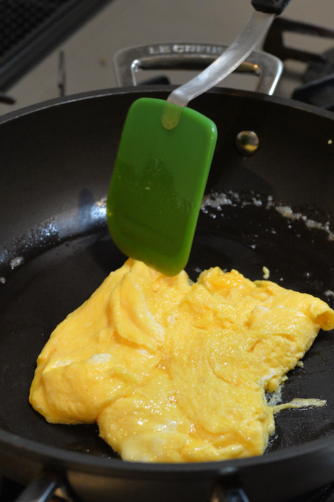 ほぐした玉子を加えてサッとかき混ぜ、少し固まり出したら、ヘラで四隅を折り、パンの大きさに揃え、塩・コショウをふる。