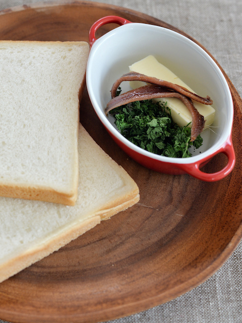 パンにアンチョビーバターを塗り、オーブントースターで2分ほど焼く。好きな大きさに切る。