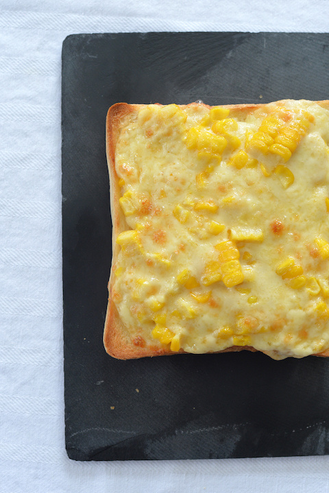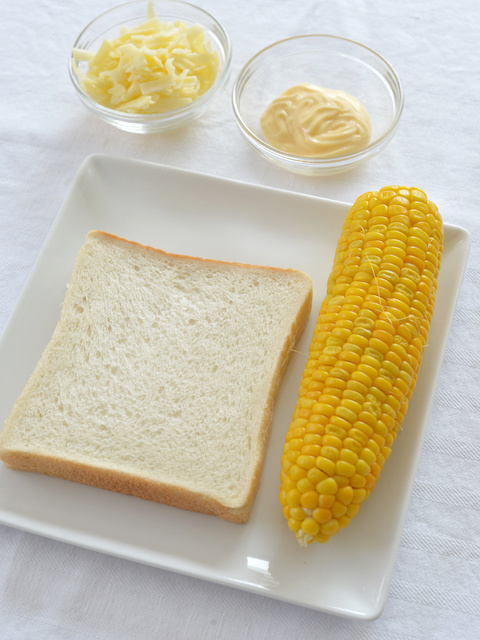 トウモロコシ、ピザ用チーズ、マヨネーズを混ぜて、パンの上にのせる。