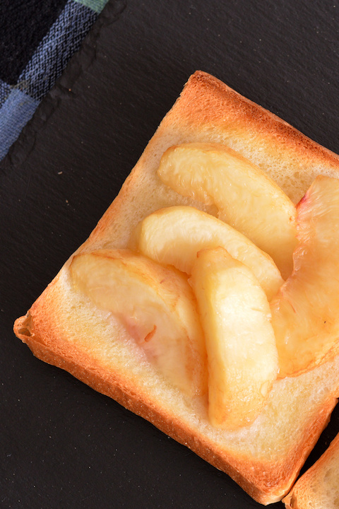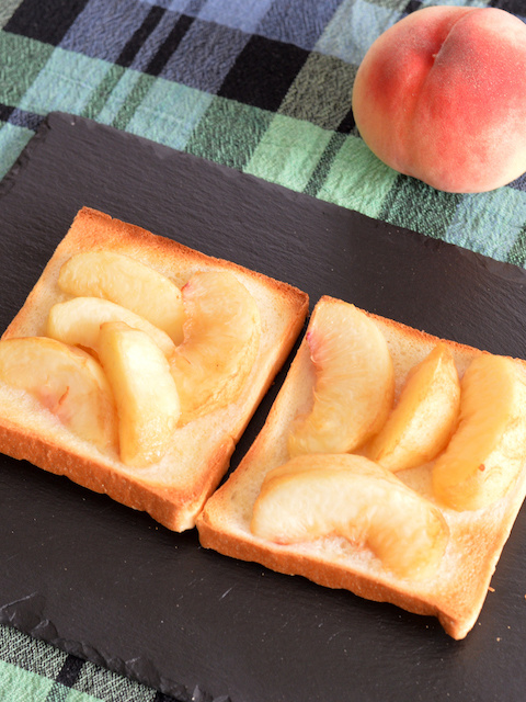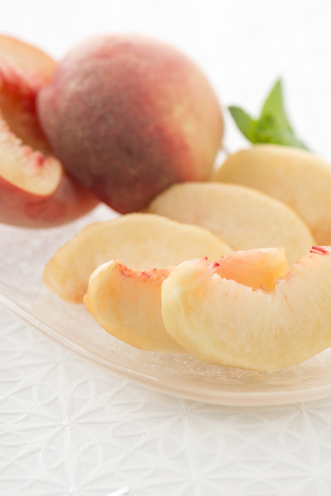 桃は半分に切り、種を取り除いて皮をむき、8等分に切る。
