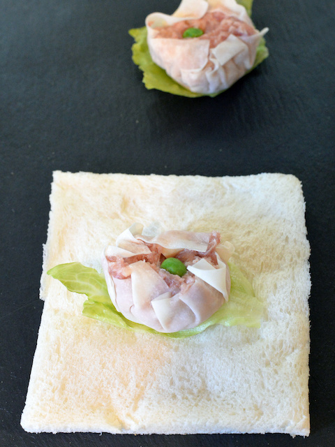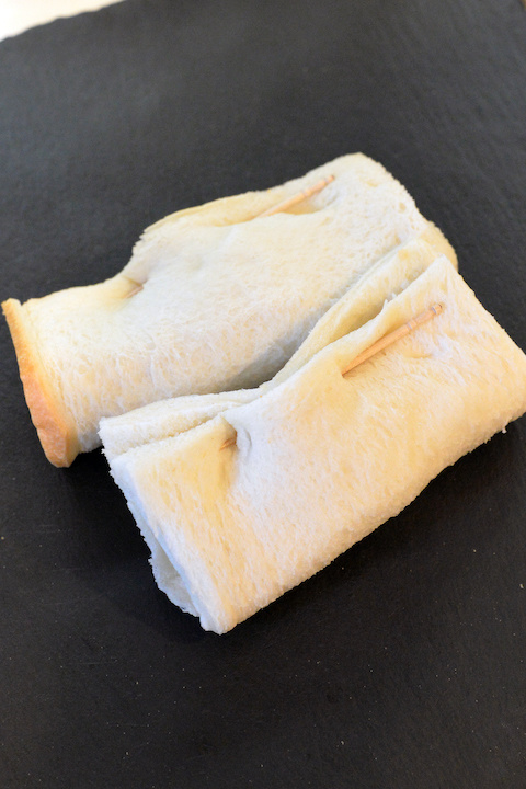 パンの耳は切り落とし、真ん中に焼売をおく。パンを2つに折り、爪楊枝で止める。両端は手で押さえて軽くつぶす。