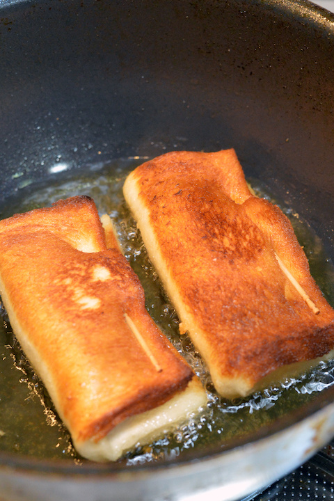 パンの耳は切り落とし、真ん中にバナナをおく。パンを2つに折り、爪楊枝で止める。両端は手で押さえて軽くつぶす。油で狐色になるまで揚げる。グラニュー糖をかけ、お好みでシナモンパウダーをふる。