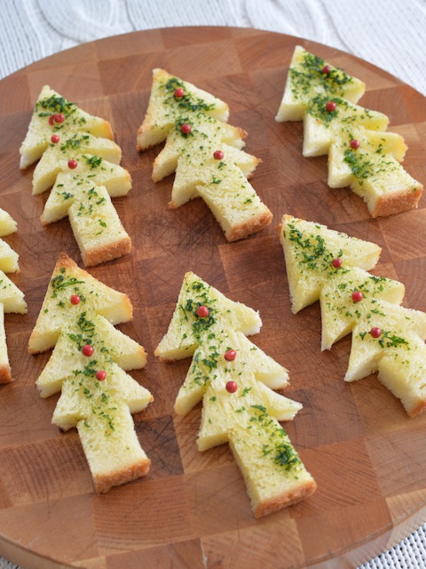パンはナイフでツリー型に切る。溶かしバターを塗り、軽くトーストする。パセリをふり、ピンクペッパーを飾る。