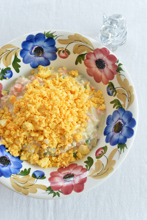 ジャガイモ、ニンジン、インゲンは2センチ角に切り、水から柔らかくなるまで茹で、湯切りする。ピクルスは細かく切る。ツナ缶はほぐす。