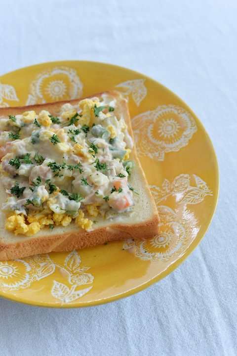 軽くトーストしたパンに2のロシア風ポテトサラダをたっぷりのせてできあがり!