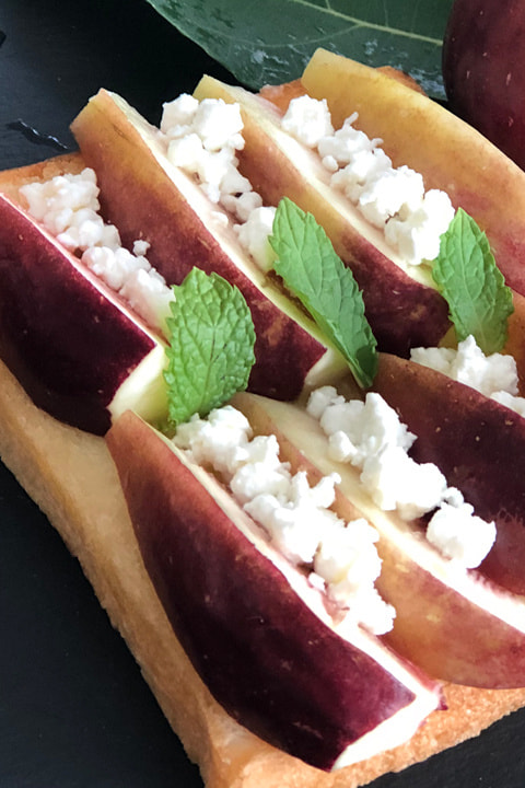 イチジクは皮付きのまま縦に8等分に切り、トーストの上に並べる。カッテージチーズをおき、ミントを飾る。