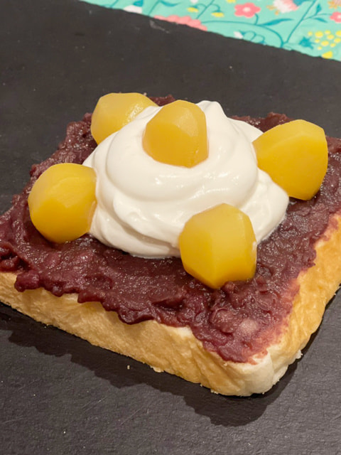 パンの上にあずき煮を敷き詰め、グラニュー糖を混ぜて泡立てた生クリームと栗を飾って、できあがり!簡単です!