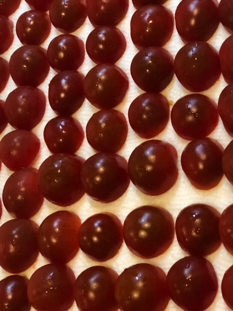 ミニトマトは半分に切り、キッチンペーパーまたはペーパータオルの上に切り口を下にして10分程置いて水分を取る。
