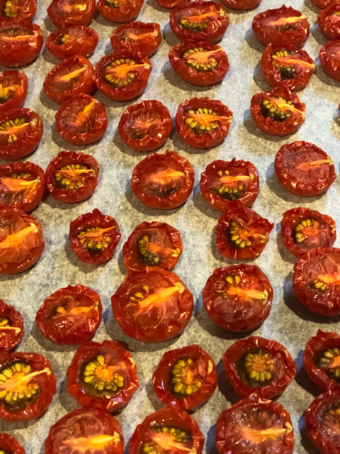 オーブンの鉄板の上にクッキングシートを敷き、その上に水気を取り除いたミニトマトの切り口を上向きにしてから、軽く塩をふる。120度のオーブンで90分焼く。