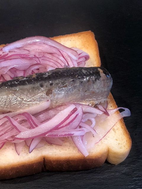 パンをトーストしてからバターを塗り、上に紫玉ネギのマリネをのせ、オイルサーディンを飾ります。
