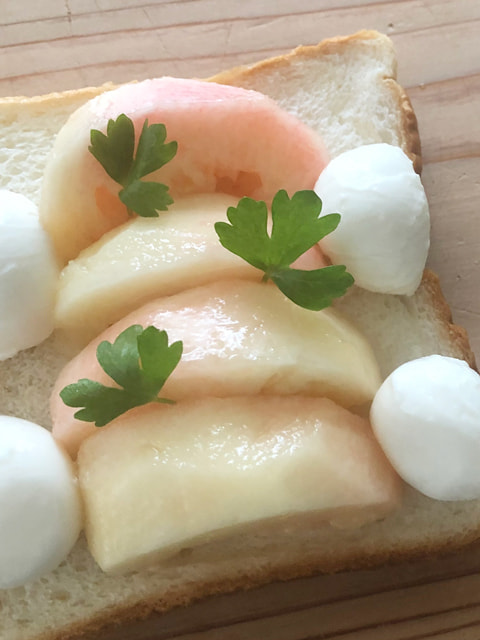 アイス食パンに水切りしたヨーグルトを塗り、上に桃とミニモッツァレラとハーブを飾る。
