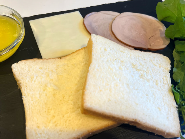 パンの両面に溶かしバターを塗り、チーズ、ハム、ルッコラを挟んでホットサンドメーカーで焼く。