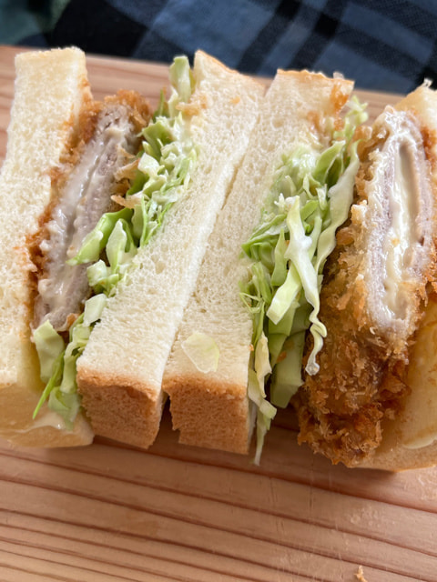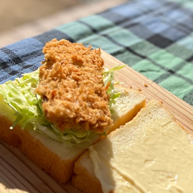 パンに溶かしバターとマヨネーズを塗り、キャベツとヒレカツを挟む。