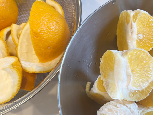 白い部分をたっぷりと付けて皮をむく。(皮の裏の白い部分にはペクチンが含まれているので、とても大切)