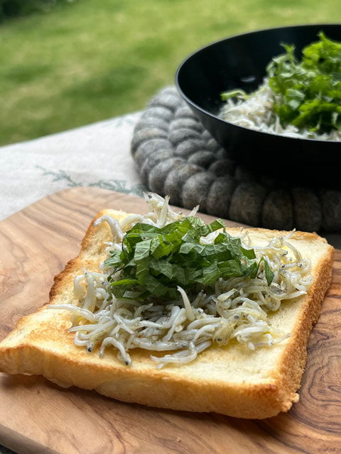 フライパンにオリーブオイルとニンニクの微塵切りを入れて良い香りがしてきたら、釜揚げシラスを加えて炒める。上にせん切り大葉をのせる。